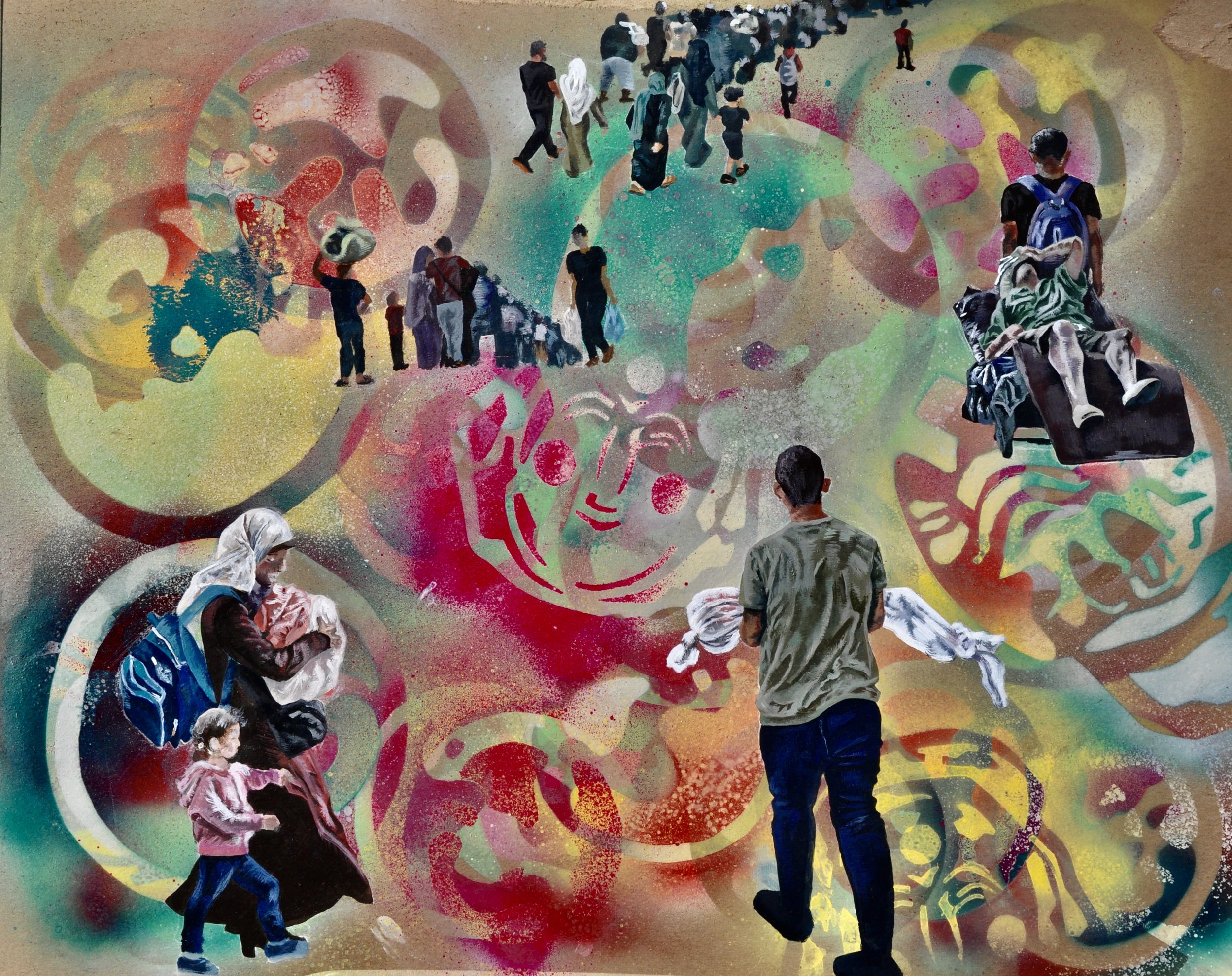 Shalom Salaam (“Peace”) | 2023. Spray paint and charcoal on cardboard and foam. 30 x 40 inches.